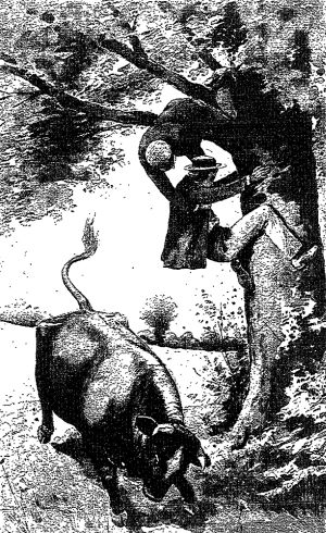 As they ran, threading their way among the bushes, and springing from hillock to hillock, they heard an ominous grunting bellow on their right, and turning sharply they saw a large dark-red bull stepping out from under the shade of a maple tree. The animal bellowed again, deep in his throat; and running his horns into the nearest mound, tossed into the air a little shower of turf and moss. This was an honest challenge, but our runners were in no mood to accept it.