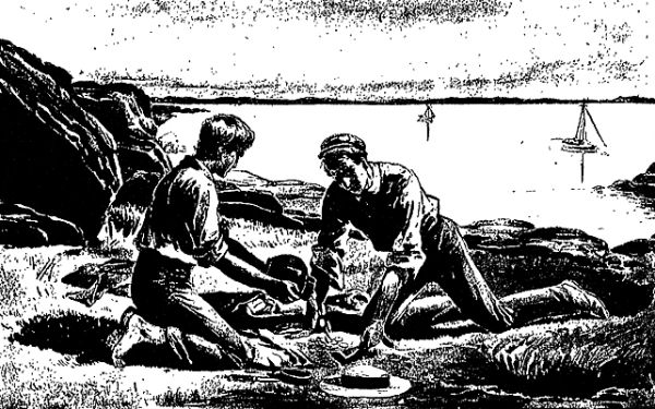 This lotus-eating mood, with a few intervals, must have lasted four or five hours. The tide had turned and been a good three hours on the ebb. At last he observed vaguely that he was just off the promontory where he and Will had been caught in the cave. Thinking of the dangers of the locality, he steered a point or two further out to give the sunken reefs a wide berth. As he did so he noticed that the tide was out as far as the foot of the bluff, and that the cove flats were all uncovered. He was fairly past the point when out of the tail of his eye he caught a movement among the rocks just where the cave mouth lay. Turning his head quickly, he saw Mart Gandy step forward and raise his great duck gun to his shoulder.
