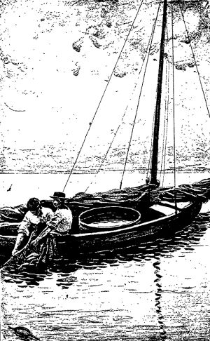 Will was already noosing a couple of ropes. The Dido was brought alongside the rolling carcass, and after a great deal of difficulty the nooses were made fast to its head and tail. In the effort to hoist the heavy mass aboard the boat was nearly swamped; and at one time Will offered to give up the job. But Reube generously insisted on continuing. At last, by waiting till a wave rolled boat and carcass, together in just the most propitious way possible, the thing was accomplished with a sudden hoist. Along with the great fish a barrel or two of water came aboard; and while Reube steered, Will was kept busy for a half hour bailing the boat out.