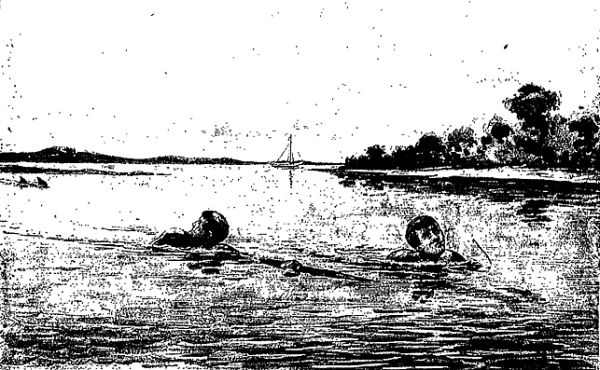 With long, powerful strokes they sped across the narrow channel that divided them from safety. Will, swimming at much less than his full speed, dropped almost a yard behind as soon as they were fairly started, and swam on his side so as to command a view of the water behind. The narrow ridge of yet uncovered sand, however, prevented him from seeing what took place when he and Reube slipped noiselessly, as they thought, into the water. Those black fins had turned on the instant, and were darting with terrific speed for the lower end of the sand spit.