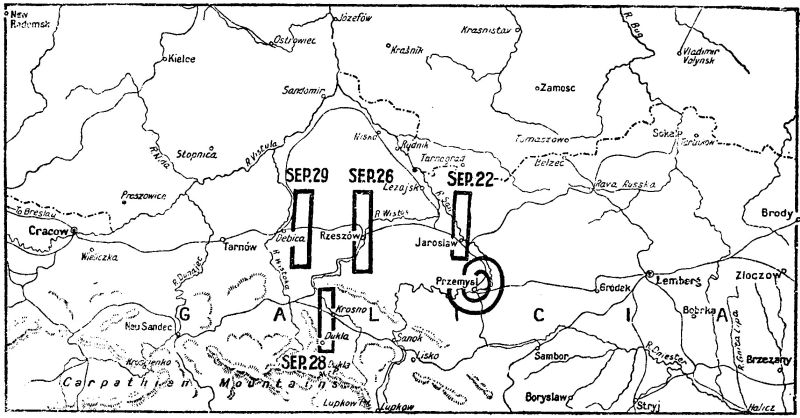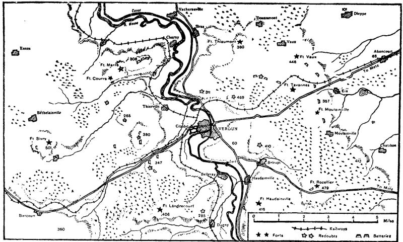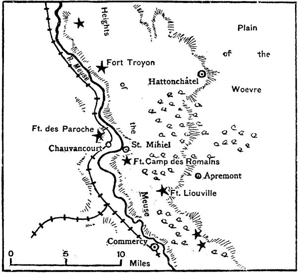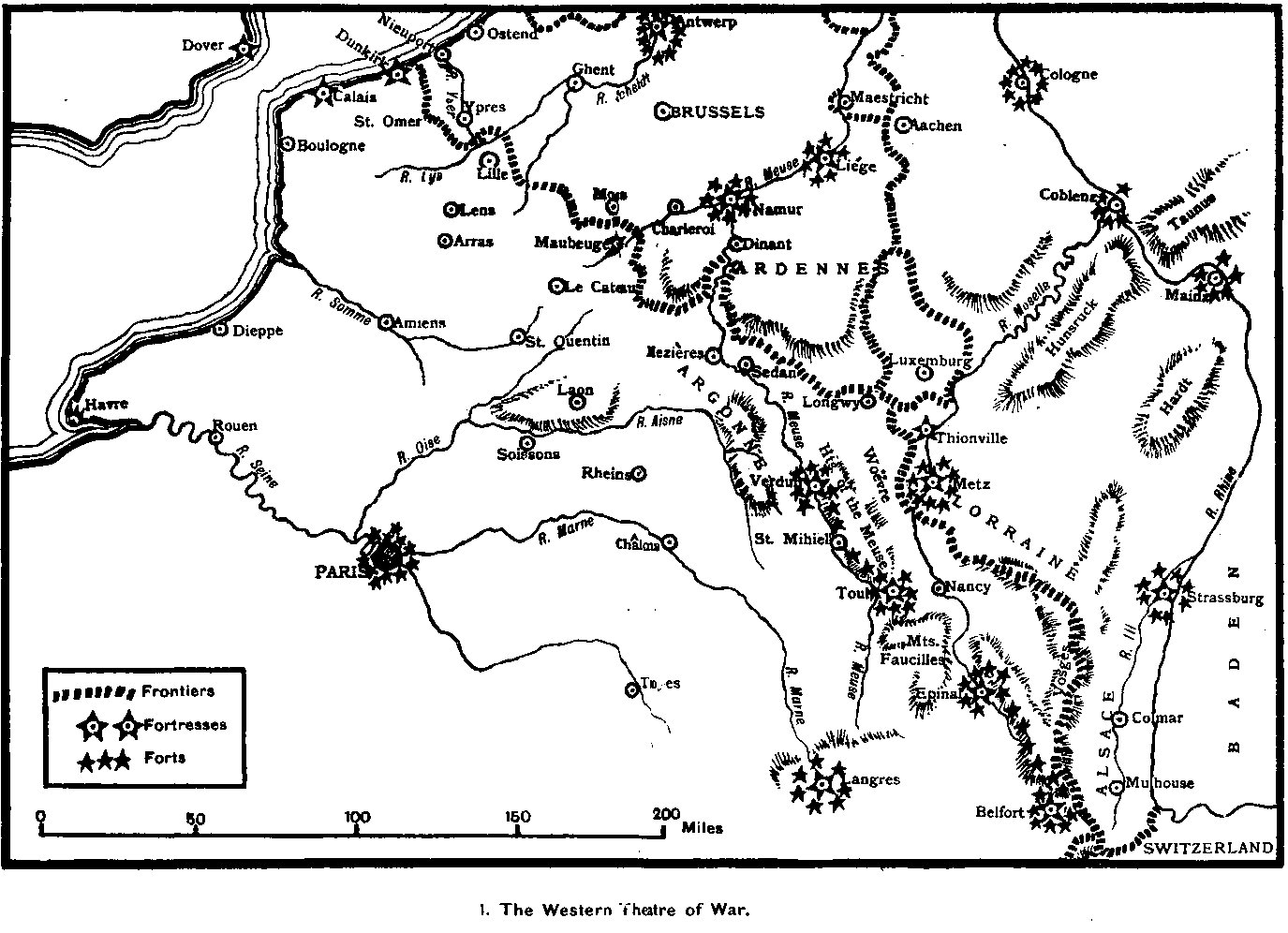 Von Kluck, with the 1st German Army, held the western section from the Forest of the Eagle to the plateau of Craonne. He had against him Maunoury’s 6th French Army—whose left wing was also destined to work up the Oise towards Lassigny and Noyon—the British army, and the 5th French Army of d’Esperey. Von Buelow held the ground from von Kluck’s left, from the Aisne crossing at Berry-au-Bac, along the line of the Suippe. The Saxon general, von Hausen, about this time fell sick, and was relieved of his command, and the Saxon troops seem to have been joined to von Buelow’s forces. Against von Buelow was ranged the 9th Army of General Foch, some corps of which may have been detached for reserves elsewhere. The line of Northern Champagne was defended by the Duke of Wurtemberg, who joined hands in the Argonne with the Crown Prince. The French in Champagne were Langle’s 4th Army, advancing against the Bazancourt-Grand Pré line. The Crown Prince was faced by Sarrail’s 3rd Army, which at once set itself to entrenching and to enlarging the Verdun enceinte, with a clear perception of the truth that, if Verdun was to be held, the big German howitzers must be kept out of range. In the south of the Woëvre, linked with Sarrail by the forts of the Meuse, the 2nd Army of de Castelnau was fronting the Bavarians, while Dubail held a portion of the Vosges and rested his right on Belfort.
