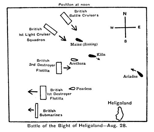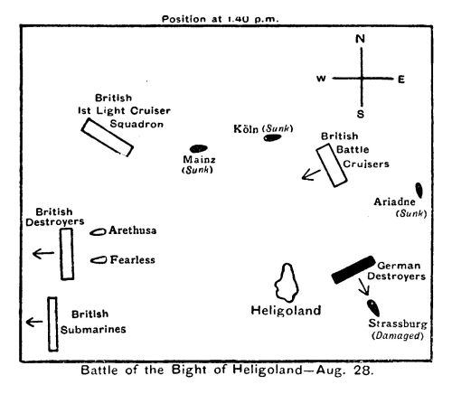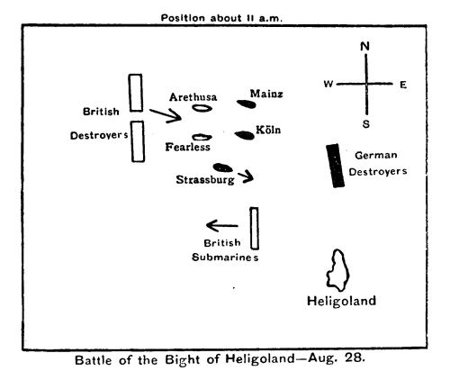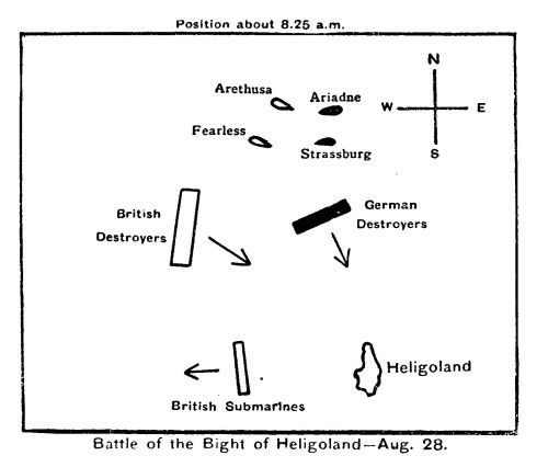 The submarines, foremost among them E6, E7, and E8, performed admirably the work of a decoy. 7-8.25 a.m. They were apparently first observed by a German seaplane, and presently from behind Heligoland came a number of German destroyers. These were presently followed by two cruisers, and the submarines and their attendant destroyers fled westwards, while the British destroyer flotillas came swiftly down from the north-west. At the sight of the latter the German destroyers turned to make for home; but the British flotillas, led by the Third, along with the Arethusa, altered their course to port in order to head them off. “The principle of the movement,” says the official report, “was to cut the German light craft from home and engage them at leisure in the open sea.” The destroyers gave little trouble, and our own ships of that class were quite competent to deal with them. But between our two attendant cruisers and the two German cruisers a fierce battle was waged. About eight o’clock the Arethusa—praeclarum et venerabile nomen—was engaged with the German Ariadne, while the Fearless was busy with a four-funnelled vessel which some of our men thought was the Yorck, but which was probably the Strassburg. The Arethusa, till the Fearless drew the Strassburg’s fire, was exposed to the broadsides of the two vessels, and was considerably damaged. About 8.25, however, one of her shots shattered the forebridge of the Ariadne and killed the captain, and the shattered vessel drew off towards Heligoland, whither the Strassburg soon followed.