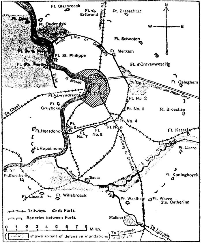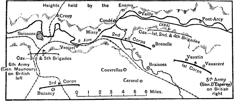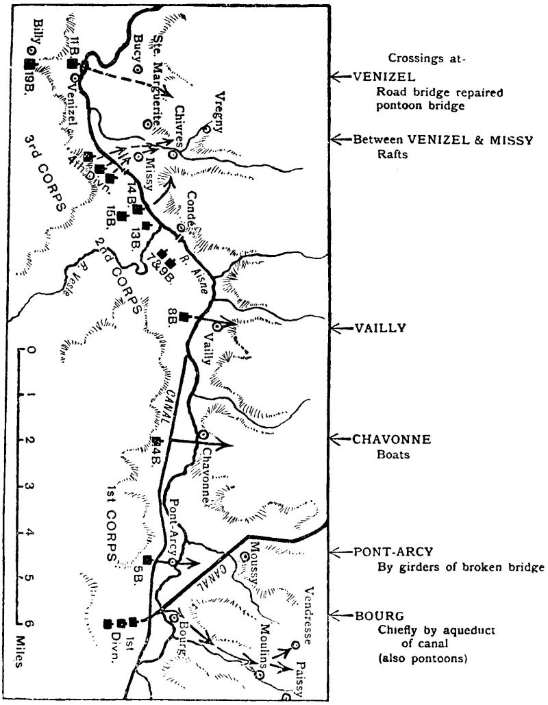Sunday, the 13th, was the beginning of the passage of the Aisne. The 6th French Army constructed Sept. 13. pontoons at various places under a heavy fire, and several divisions were got over. Vic and Fontenoy were the chief crossings, for a pontoon bridge at Soissons itself was made impossible by the guns on the northern heights. A number of French infantry did succeed in making a passage by means of the single girder which was all that was now left of the narrow-gauge railway bridge. To the east the British operations during the day were full of interest. The Third Corps attempted the section between Soissons and Venizel. The Aisne was in high flood, and the heavy rain made every movement difficult. Its bridging train attempted to build a heavy pontoon bridge on the French right, but this failed, like the similar French attempt, owing to the fire of the German howitzers. The 19th Brigade was left behind in reserve at Billy, while the 11th Brigade seems to have got across the river either during the night or very early in the morning, for during the day it held a position on the northern slopes east of Bucy. At Venizel there was a road bridge, not completely destroyed, which was mended sufficiently to allow of the passage of field-guns. A pontoon bridge was built beside it, and early in the afternoon the whole of the 4th Division was across, and co-operating with the left of the Second Corps against the German positions at Chivres and Vregny.
