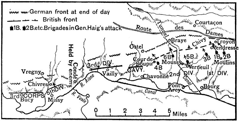 About four in the afternoon the commander of the First Corps ordered a general advance. From then till daylight departed there was a heavy engagement, which resulted in a clear British success. At nightfall we held, not indeed the Ladies’ Road, but a position which ran from a point on the north-east of Troyon, through Troyon and Chivy to La Cour de Soupir, while Briggs’s cavalry carried it down to the Soissons road west of Chavonne. The whole day’s work was well conceived and brilliantly executed, and gave the Allies for the first time an entrenched position on the plateau itself. Twelve field-guns, several machine-guns, and 600 prisoners were taken by the infantry, and the cavalry also made many captures. But the success was not won without cost. The Welsh regiment, in the 3rd Brigade at Chivy, fought gallantly under the heroic inspiration of Captain Mark Haggard, and when that officer fell mortally wounded, he was picked up under heavy fire by Lance-Corporal William Fuller, who received the Victoria Cross. One of the most amazing exploits of the war was performed by Private George Wilson of the Highland Light Infantry, when the 5th Brigade were in action at Verneuil. Accompanied by one man, he attacked a German machine-gun. His comrade was killed, but he advanced alone, shot the officer in charge, and captured the gun, after shooting or bayoneting the six Germans who worked it. For this berserker deed he received the Victoria Cross. The mortality among the commissioned ranks of the First Corps was very heavy. One brigade alone, as Sir John French reports, lost three of its four colonels. Lieutenant-Colonel Adrian Grant-Duff of the Black Watch, Lieutenant-Colonel Montresor of the Sussex, Lieutenant-Colonel Lloyd of the Loyal North Lancashires, and Lieutenant-Colonel Dawson Warren of the West Surrey were among the dead.