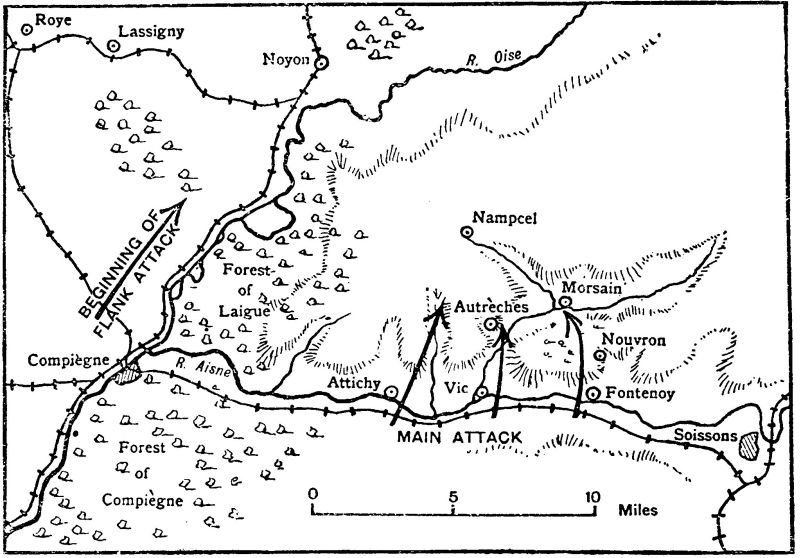 Let us glance for a moment at the topography of those wide grassy vales of Aisne and Suippe which are scored from west to east across Northern France. The Aisne, which enters the Oise at Compiègne, has on its north side, at an average of a mile or more from the stream, a line of steep ridges, the scarp of a great plateau. The valley floor is like much other French scenery—a sluggish stream, resembling the Trent, villages, farmhouses, unfenced fields of crops, poplar-lined roads, and a few little towns, the chief of which is Soissons, with its twelfth-century cathedral, the scene of many great doings in France’s history. On the north the hills stand like a wall, and the spurs dip down sharply to the vale, while between them the short and rapid brooks have cut steep re-entrant combes in the plateau’s edge. The height of the scarp varies from some 200 feet, where the uplands begin on the west above Compiègne from the Forest of the Eagle, to more than 450 feet thirty miles east in the high bluffs of Craonne. Beyond this latter place the Aisne takes a wide sweep to the north-east towards its source in the Argonne, and the banks fall to the lower level characteristic of the shallow dales of Champagne. The section from Compiègne to Craonne is everywhere of the same type, with sometimes a bolder spur and sometimes a deeper ravine. The top of the plateau cannot be seen from the valley, nor even from the high ground to the south. It is muffled everywhere by a cloak of woods—what are called in Hampshire “hangers”—which dip over the edge and descend for some distance towards the river. The lower slopes are, for the most part, steep and grassy, with enclosed coppices here and there. The plateau stretches back for some miles, till at La Fère and Laon it breaks down into the plains of north-eastern France.