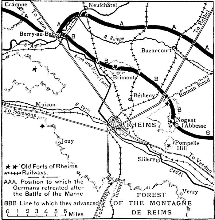 The German armies had chosen for their stand, not the line of the Aisne, but the crest of the plateau beyond it, at an average of two miles from the stream side. Long before it had been decided upon, and as they advanced to the Marne, they left parties of sappers to prepare the trenches. A more perfect position could not be found.[1] It commanded all the crossings of the river and most of the roads on the south bank, and even if the enemy reached the north side the outjutting spurs gave excellent opportunities for an enfilading fire. The blindness of the crests made it almost impossible for the German trenches to be detected. Eastward towards Neufchâtel, where the Aisne valley changed its character, the line crossed the river, and followed in a wide curve the course of the Suippe, keeping several miles back from the stream on the northern slopes. Here the position was still stronger. Before them they had a natural glacis, and across the river they could command the bare swelling downs for miles. The line crossed the Champagne-Pouilleuse, with the Bazancourt-Grand Pré railway behind it, and rested on the Argonne, to the east of which the army of the Imperial Crown Prince was ringing Verdun on north and east from Montfaucon to the shaggy folds of the Woëvre.