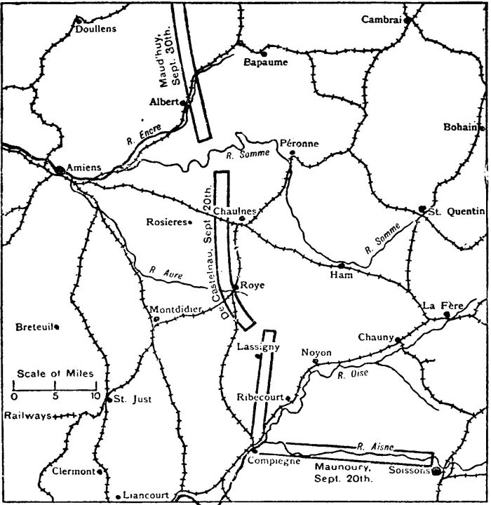 The next day, Tuesday, the 15th, saw a series of violent German counter-attacks along the western Sept. 15. front. Maunoury’s 6th Army was the chief sufferer. From their main position at Nampcel the Germans drove the French out of their posts on the crests of the spurs, recaptured Autrèches, and forced the French right out of the Morsain ravine and off the spurs of Nouvron. By the Wednesday morning the French were back on a line close to the Aisne, and only a few hundred yards north of their original crossing-places at Vic and Fontenoy. Soissons was heavily shelled, and all the northern part of the town was gutted by fire. The French left, however, continued its flanking movement up the Oise on the west side of the Forest of the Eagle, and on this day made considerable progress in the direction of Noyon. On the British left the 4th Division of the Third Corps was severely handled, but stood stoutly to the ground it had won south of Vregny. The 5th Division felt the weight of the same onslaught, and was enfiladed on its left by the German fire from Vregny, and could not advance in face of the heavy artillery posted north of Chivres and Condé. In the evening it was forced back almost to the line of the stream, and held the ground between Missy and Ste. Marguerite—a line dominated everywhere by the guns on the heights. The 3rd Division on its right was more fortunate, for it advanced from Vailly, and retook the high ground from which it had been evicted the day before. The British right had a long day of counter-attacks, which it succeeded in repulsing, and the 4th (Guards) Brigade in particular gave the enemy much punishment. In this action Bombardier Ernest Harlock of the 113th Battery R.F.A. received the Victoria Cross for his gallantry in returning twice to lay his gun, though badly wounded. By the evening the British line was fairly comfortable, except for the precarious situation of the 4th and 5th Divisions.