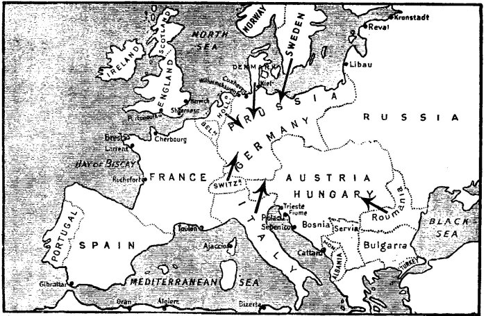 In Nelson’s day we had one advantage which is now lost to us. We were not hampered by a code of maritime law framed in the interests of unmaritime nations. The Declaration of Paris of 1856, among other provisions, enacted that a neutral flag covered enemy’s merchandise except contraband of war, and that neutral merchandise was not capturable even under the enemy’s flag. This Declaration, which was not accepted by the United States, has never received legislative ratification from the British Parliament; but we regarded ourselves as bound by it, though various efforts had been made to get it rescinded in times of peace by those who realized how greatly it weakened the belligerent force of a sea power. The Declaration of London of 1909 made a further effort to codify maritime law.[3] It was signed by the British plenipotentiaries, though Parliament refused to pass the statutes necessary to give effect to certain of its provisions. In some respects it was more favourable to Britain than the Declaration of Paris, but in others it was less favourable, and it was consistently opposed by many good authorities on the subject. Generally speaking, it was more acceptable to a nation like Germany than to a people situated like ourselves.[4] When war broke out the British Government announced that it accepted the Declaration of London as the basis of our maritime practice. The result was a position of some confusion, for the consequences of the new law had never been fully realized. Under it, for example, the captain of the Emden could justify his sinking of British ships instead of taking them to a port for adjudication. One provision, which seems to have been deduced from it, was so patently ridiculous that it was soon dropped—that belligerents (that is, enemy reservists) in neutral ships were not liable to arrest. Presently successive Orders in Council, instigated by sheer necessity, altered the Declaration of London beyond recognition. The truth was, that we were engaged in a war to which few a priori rules could be made to apply. Germany had become a law unto herself, and the wisest course for the Allies was to frame their own code, which should comply not only with the half-dozen great principles of international equity, but with the mandates of common sense.
