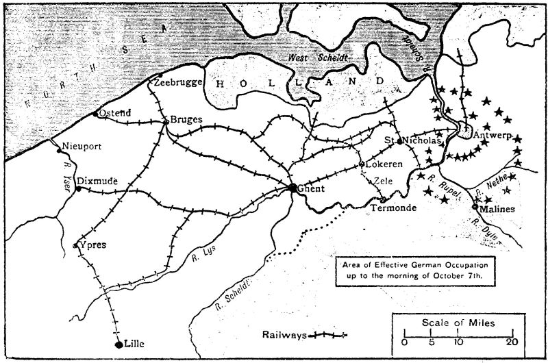 Of the Battle of the Bight it may fairly be said that it was creditable to both victors and vanquished. The Germans fought in the true naval spirit, and the officers stood by their ships till they went down. The gallantry of our own men was conspicuous, as was their readiness to run risks in saving life, a readiness which the enemy handsomely acknowledged. The submarine flotilla fought under great disadvantages, but the crews never wavered, and their attendant destroyers, the Lurcher and the Firedrake, were constantly engaged with heavier vessels. The two destroyer flotillas were not less prominent, and, having taken the measure of the German destroyers, did not hesitate to engage the enemy’s cruisers. But the chief glory belongs to the Arethusa and the Fearless, who for a critical hour bore the chief brunt of the battle. For a time they were matched against three German cruisers, which between them had a considerably greater force of fire. Nowadays much of naval fighting is a mathematical certainty, for, given the guns and the speed, you can calculate the result. But it was the good fortune of the Arethusa to show her mettle in a conflict which more resembled the audacious struggles of Nelson’s day. It is a curious fact that though we had some sixty vessels in the action from first to last, only four or five were hit. The light-cruiser squadron and the battle cruisers decided the battle, and while their blows were deadly, the enemy never got a chance of retaliation. From twelve o’clock onward it was scientific modern destruction; before that it was any one’s fight.