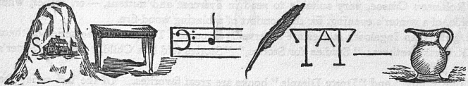 Some familiar quotation (not from the Bible) is the most suitable subject for a Rebus. And those are the best rebuses which read in the same way to the ear and to the eye, and in which one word does not run into another. In charades, also, the syllable-words should be pronounced exactly as in the whole word they compose. And do not forget that every answer of an enigma, partial and entire, should be numbered and written out in full;—also that letters which are most plainly and neatly written, and on one side of the sheet only, are those which an editor is likely to read first.