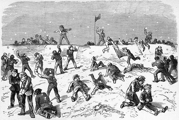Before the action commenced, a meeting was arranged between the rival commanders, who drew up and signed certain rules and regulations respecting the conduct of the battle. As it was impossible for the North-Enders to occupy the fort permanently, it was stipulated that the South-Enders should assault it only on Wednesday and Saturday afternoons between the hours of two and six. For them to take possession of the place at any other time was not to constitute a capture, but on the contrary was to be considered a dishonorable and cowardly act. The North-Enders, on the other hand, agreed to give up the fort whenever ten of the storming party succeeded in obtaining at one time a footing on the parapet, and were able to hold the same for the space of two minutes. Both sides were to abstain from putting pebbles into their snow-balls, nor was it permissible to use frozen ammunition. A snow-ball soaked in water and left out to cool was a projectile which in previous years had been resorted to with disastrous results.