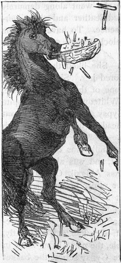 Kitty Collins, for some reason or another, was afraid of the pony, or pretended to be. The sagacious little animal knew it, of course, and frequently, when Kitty was hanging out clothes near the stable, the mare, being loose in the yard, would make short plunges at her. Once Gypsy seized the basket of clothes-pins with her teeth, and rising on her hind legs, pawing the air with her fore feet, followed Kitty clear up to the scullery steps.