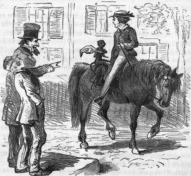 One afternoon as I was cantering through the crowded part of the town, I noticed that the people in the street stopped, stared at me, and fell to laughing. I turned round in the saddle, and there was Zany, with a great burdock leaf in his paw, perched up behind me on the crupper, as solemn as a judge.