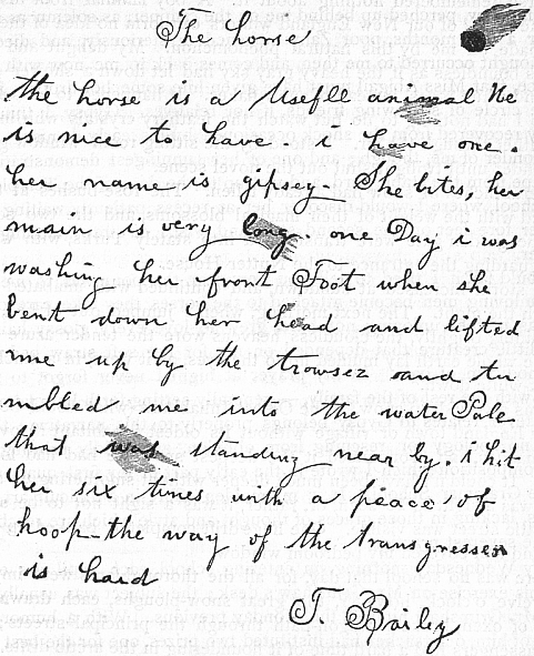 Whatever relates to Gypsy belongs properly to this narrative; therefore I offer no apology for rescuing from oblivion, and boldly printing here, a short composition which I wrote in the early part of my first quarter at the Temple Grammar School. It is my maiden effort in a difficult art, and is, perhaps, lacking in those graces of thought and style which are reached only after the severest practice.
