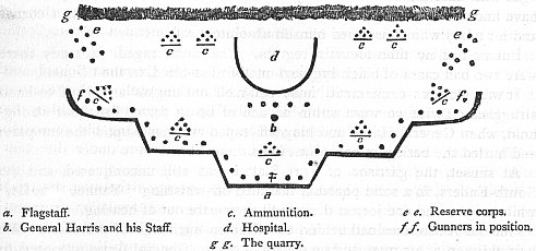 The rear of the intrenchment, being protected by the quarry, was left open. The walls were four feet high, and twenty-two inches thick, strengthened at the angles by stakes driven firmly into the ground.