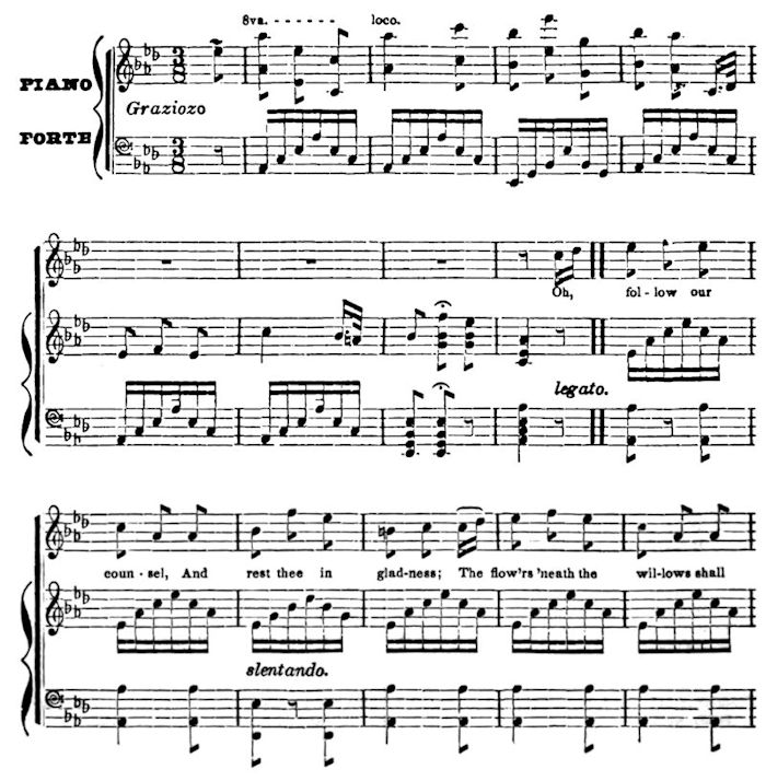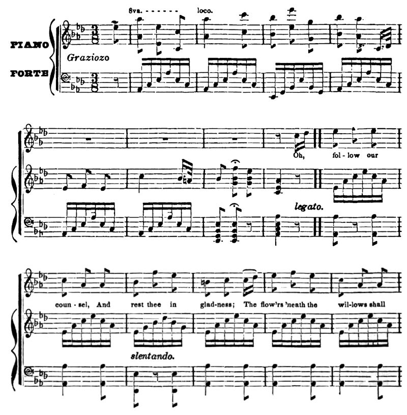 The Italian school of music divides with the German the admiration of the world. Differing widely from the German, it possesses charms equally attractive and quite as moving. If a preference is to be accorded at all, it must be given to the German school, which contains more art; this preference could, however, only be yielded by musicians. The masses are more likely to be attracted by sounds which appeal at once to the senses and charm the ear, than by strains which contain perhaps somewhat less of melody, but which stir up the passions to a greater degree and do not charm until they are understood. The Italian style is smooth, soft and melodious. Even the most martial or impassioned passages are harmonious and agreeable. The chief dependence of the composer for success would seem to be the melody of the scene which he writes. The arrangement is generally artistic, but only sufficiently so to accord with the desire of the composer to make use of the richer resources of his art. He makes the science subservient to the principle of attraction. For this reason Italian vocal music is highly preferred before Italian instrumental music. While as opera writers, the masters of Italy are deservedly famous, we seldom hear of them as composers for the piano, or of any lengthy romantic pieces in which instruments are to convey certain impressions unaided by the human voice or by personal representation.