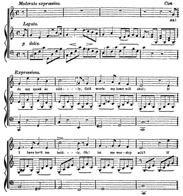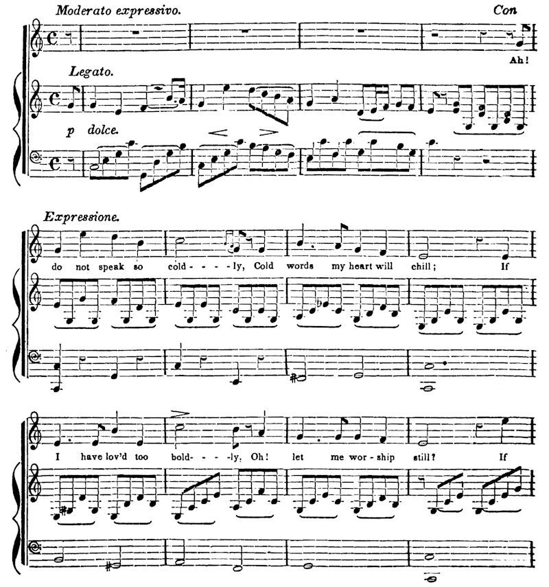 The taste for vocal gracing and adornment has increased to such a degree that it would be almost impossible to present a composition of an old master, or even of composers so late as Mozart, without adding to the adornments of the original composition. Rossini, whose vocal compositions in some places appear to consist only of connected phrases of ornaments and gracings, so completely is the melody hidden by the cadenzas, had two styles. His early style was chaste and simple; his greatest opera, Tancredi, was written in this style, and the reader, if familiar with Rossini’s works, has only to compare this beautiful opera with one of his last compositions, Semiramide, to see the strong contrast between the two styles of composition. His L’Italiani in Algeri and Il Turco in Italia, operas which contain some of his most exquisite melodies, belong also to this simple style; but his more popular operas, Il Barbiere, La Cenerentola, Otello, La Gazza Ladra, etc., are in his later style, which is florid, not only in the vocal parts, but also in the orchestral accompaniments; indeed, he seemed to have attained the extreme of this florid style, but the composers of the present time have gone far beyond him; for instance, Verdi, whose compositions appear to be entirely made up of rifioramenti, and while listening with amazement to the vocal feats his singers perform, in executing his compositions, a good old-fashioned lover of music is very apt to wonder if a melody really exists under all these embellishments.