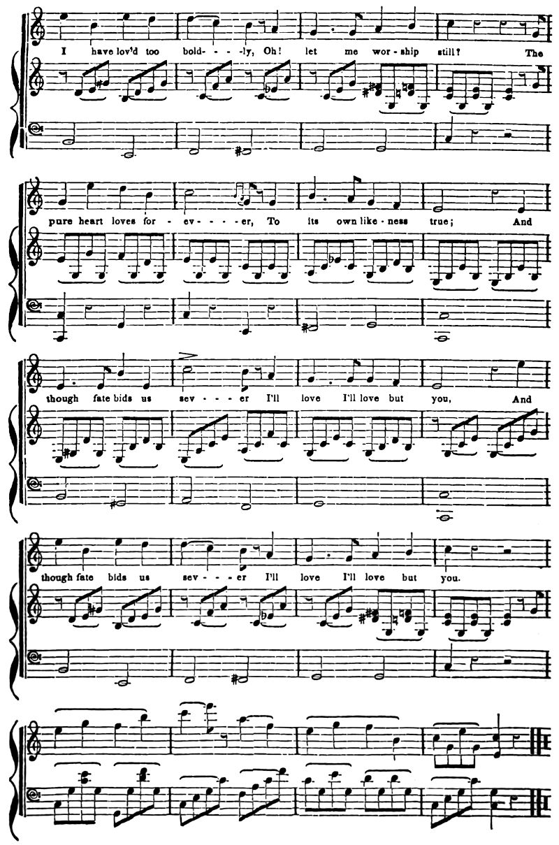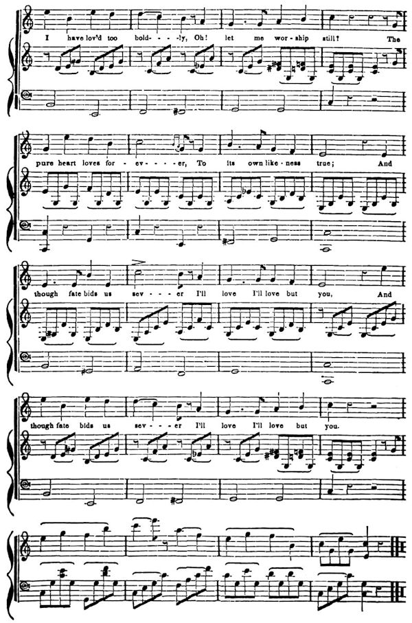 We have digressed from the original subject, dear reader, in order to show that the rifioramenti of a piece are mere additions, and also to point out to the amateur the propriety of omitting startling and surprising stage points, when presenting in private fine operatic passages, and the nice, delicate taste that would be displayed in giving more of the original melody, avoiding embellishments, using them only where they seem absolutely necessary to break up the monotony of a continuous strain, and render it more effective.