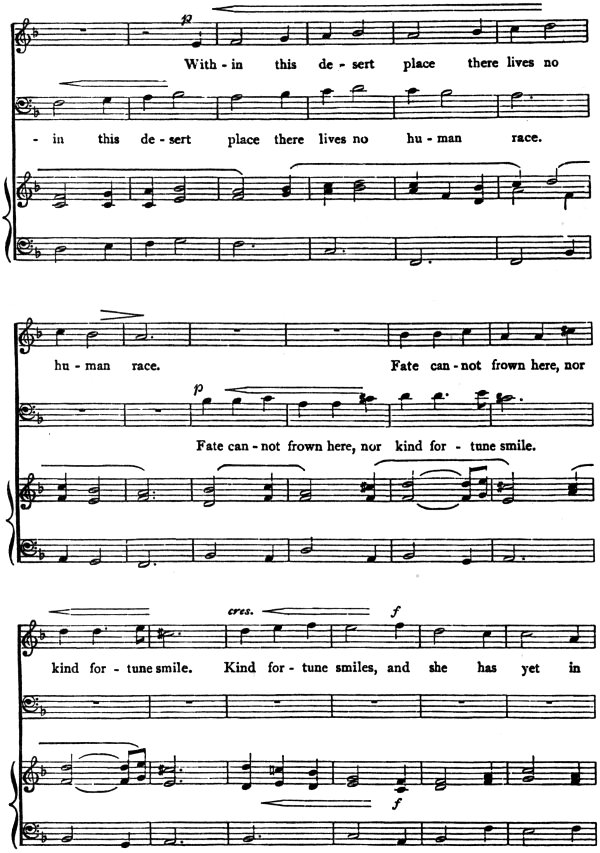 Now, what apparently was expected of a “well-brought-up” young man—one who would fulfil the conditions of 2 Peacham’s Compleat Gentleman so far as music was concerned—was that he should take part, at first sight, in a madrigal (the great vocal composition of the period) possibly in five or six parts, and to sing not from a score but from a single part—possibly also without bars; and because he had to “confess unfeignedly” that he could not, he was looked upon as one who had been badly “brought up.” I am afraid our present standard of musical education is hardly up to what was required in those days!