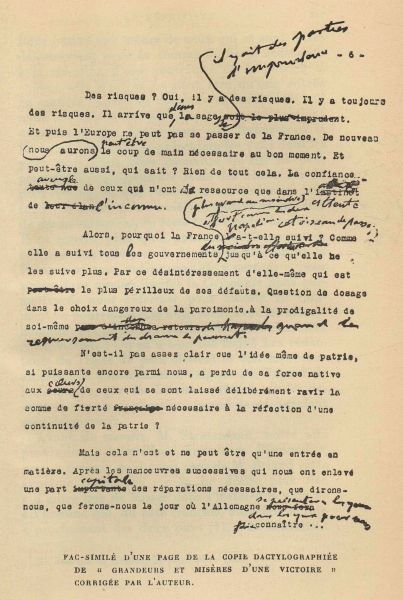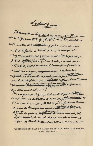 FAC-SIMILÉ D’UNE PAGE DU MANUSCRIT DE «GRANDEURS ET MISÈRES D’UNE VICTOIRE».