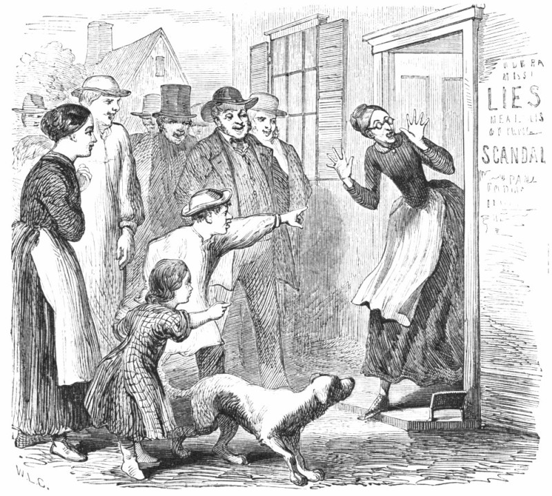 Miss Dobb looked upon the wall, and saw, in red letters, as if she had gone into business, opened a store, and put out a sign,—“MISS DOBB, Lies, Scandal, Gossip, Wholesale and Retail.”