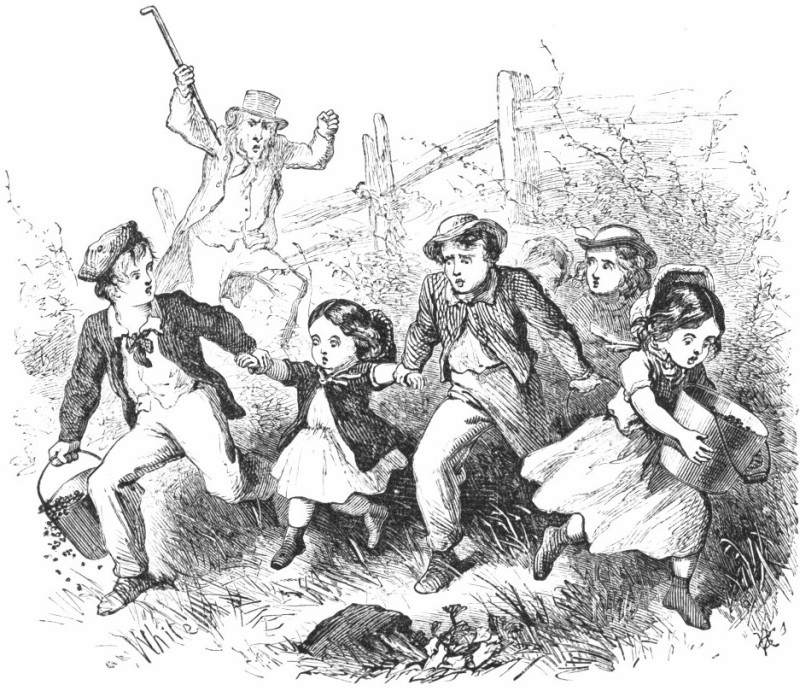 “Te-he-he-he!” snickered a little boy, who pointed to the side of the house, and the by-standers followed his lead, with a loud chorus of guffaws.