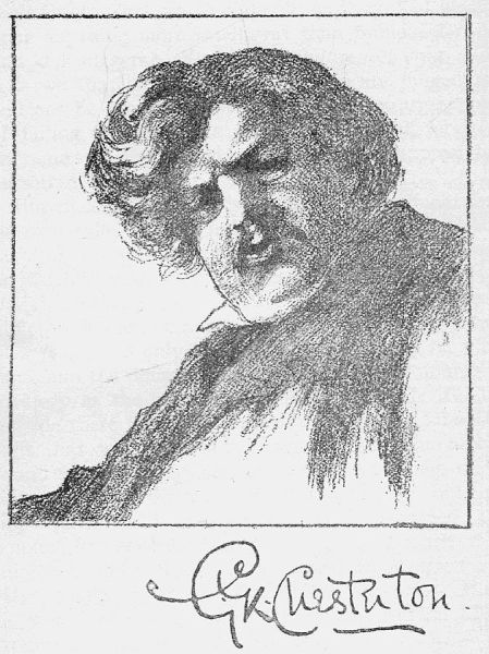 There are some men who hoard life as a miser hoards his gold—map it out with frugal care and vast prescience, spend to-day in taking thought for to-morrow. Mr. Chesterton spends life like a prodigal. Economy has no place in his spacious vocabulary. “Economy,” he might say, with Anthony Hope’s Mr. Carter, “is going without something you do want in case you should some day want something which you probably won’t want.” Mr. Chesterton lives the unconsidered, untrammelled life. He simply rambles along without a thought of where he is going. If he likes the look of a road he turns down it, careless of where it may lead to. “He is announced to lecture at Bradford to-night,” said a speaker, explaining his absence from a dinner. “Probably he will turn up at Edinburgh.” He will wear no harness, learn no lessons, observe no rules. He is himself, Chesterton—not consciously or rebelliously, but unconsciously like a natural element. St. Paul’s School never had a more brilliant nor a less sedulous scholar. He did not win prizes, but he read more books, drew more pictures, wrote more poetry than any boy that ever played at going to school. His house was littered with books, filled with verses and grotesque drawings. All attempts to break him into routine failed. He tried the Slade School, and once even sat on a stool in an office. Think of it! G. K. C. in front of a ledger, adding up figures with romantic results—figures that turned into knights in armour, broke into song, and, added together, produced paradoxes unknown to arithmetic! He saw the absurdity of it all. “A man must follow his vocation,” he said with Falstaff, and his vocation is to have none.