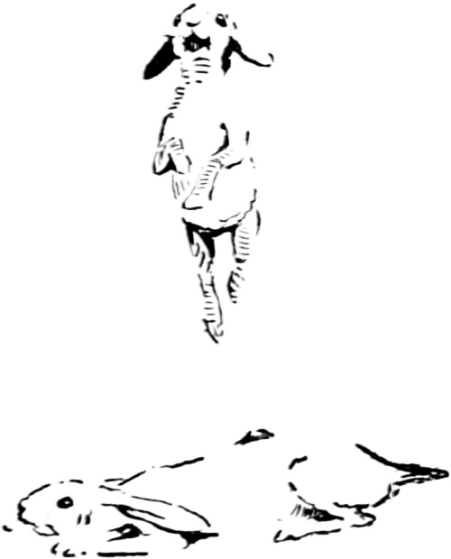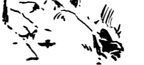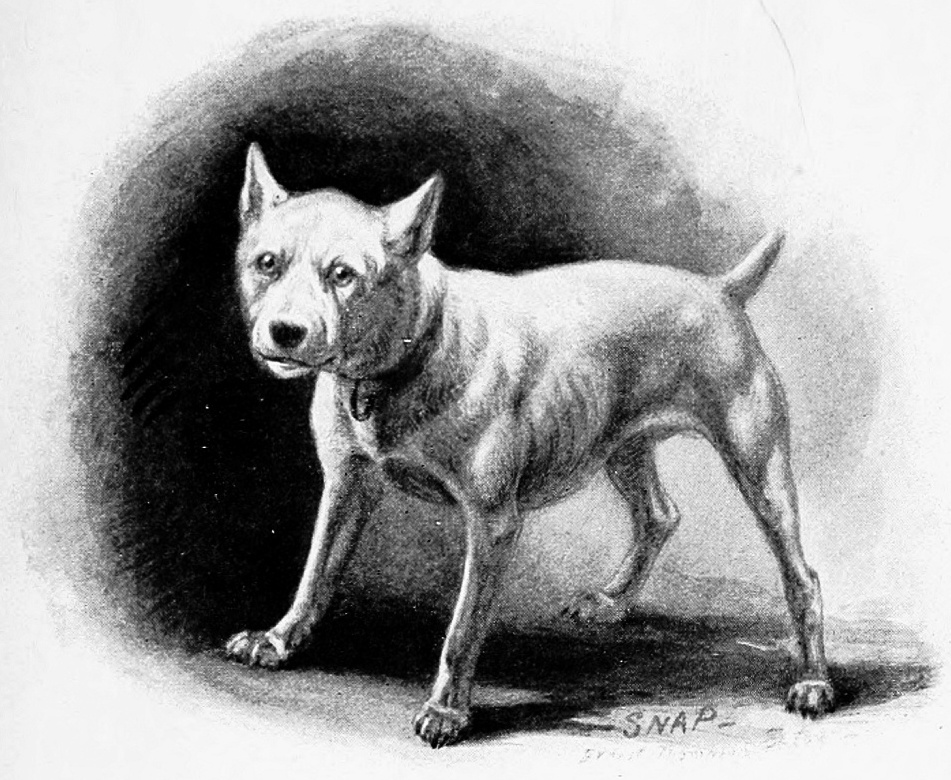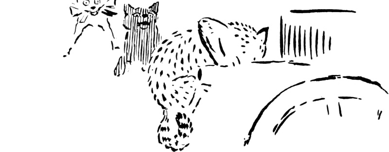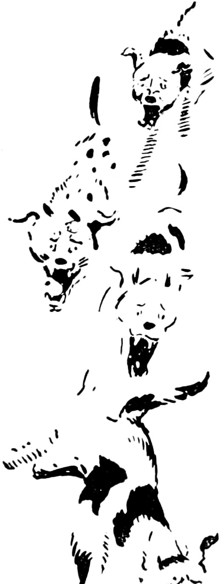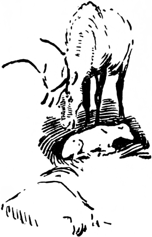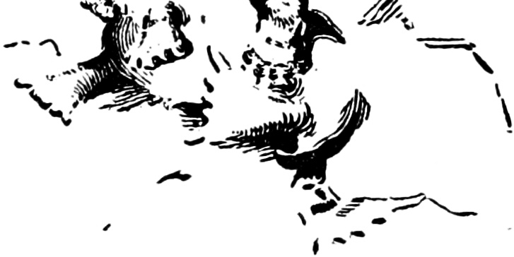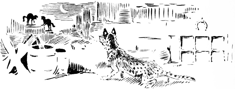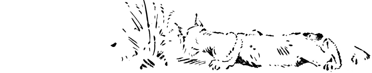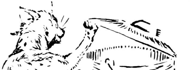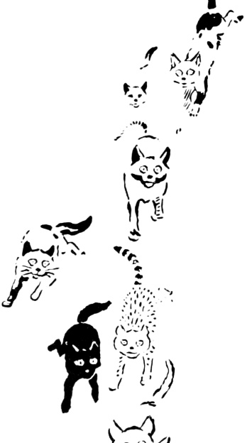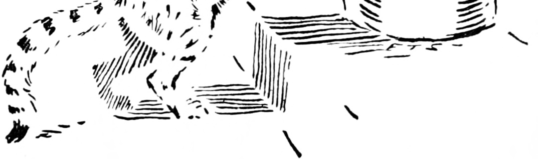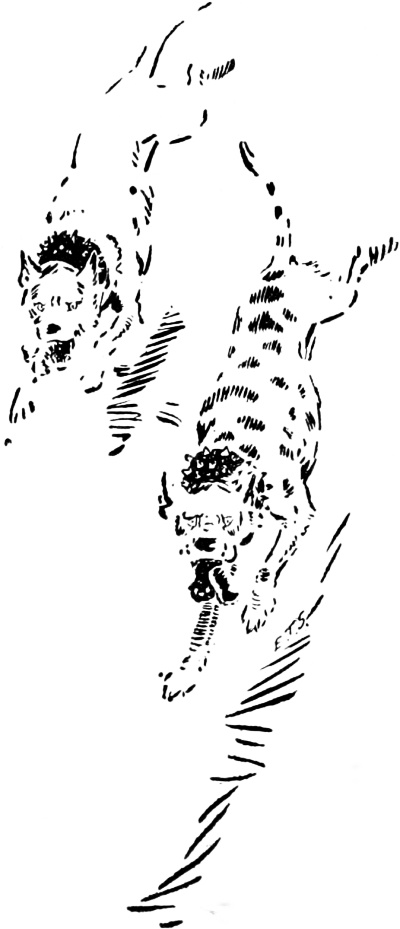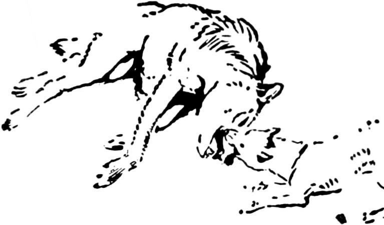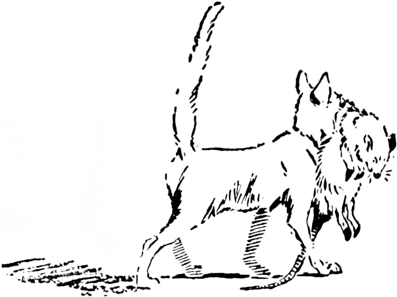 Outside this patrician ‘four hundred’ about the barrow, were other Cats, keeping away from the push-cart because they were not on the list, the Social Register as it were, yet fascinated by the heavenly smell and the faint possibility of accidental good luck. Among these hangers-on was a thin gray Slummer, a homeless Cat that lived by her wits—slab-sided and not over-clean. One could see at a glance that she was doing her duty by a family in some out-of-the-way corner. She kept one eye on the barrow circle and the other on the possible Dogs. She saw a score of happy Cats slink off with their delicious ‘daily’ and their tiger-like air, but no opening for her, till a big Tom of her own class sprang on a little pensioner with intent to rob. The victim dropped the meat to defend herself against the enemy, and before the ‘all-powerful’ could intervene, the gray Slummer saw her chance, seized the prize, and was gone.