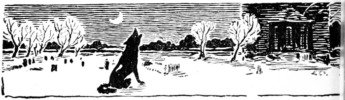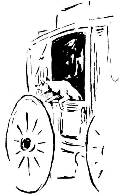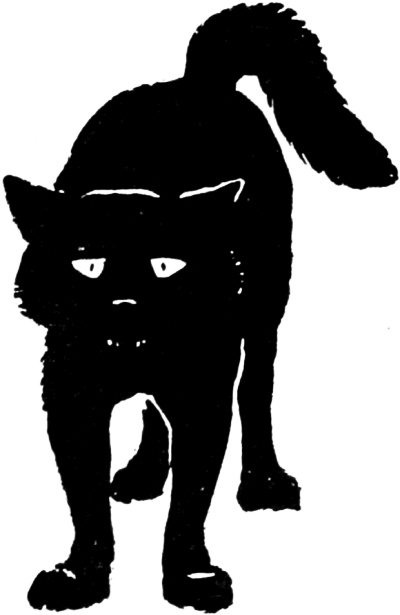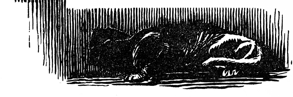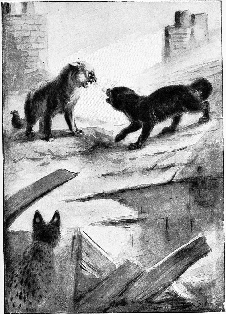 She was lying in the sun one August day, when a large Black Cat came walking along the top of a wall in her direction. She recognized him at once by his torn ear. She slunk into her box and hid. He picked his way gingerly, bounded lightly to a shed that was at the end of the yard, and was crossing the roof when a Yellow Cat rose up. The Black Tom glared and growled, so did the Yellow Tom. Their tails lashed from side to side. Strong throats growled and yowled. They approached each other with ears laid back, with muscles a-tense.