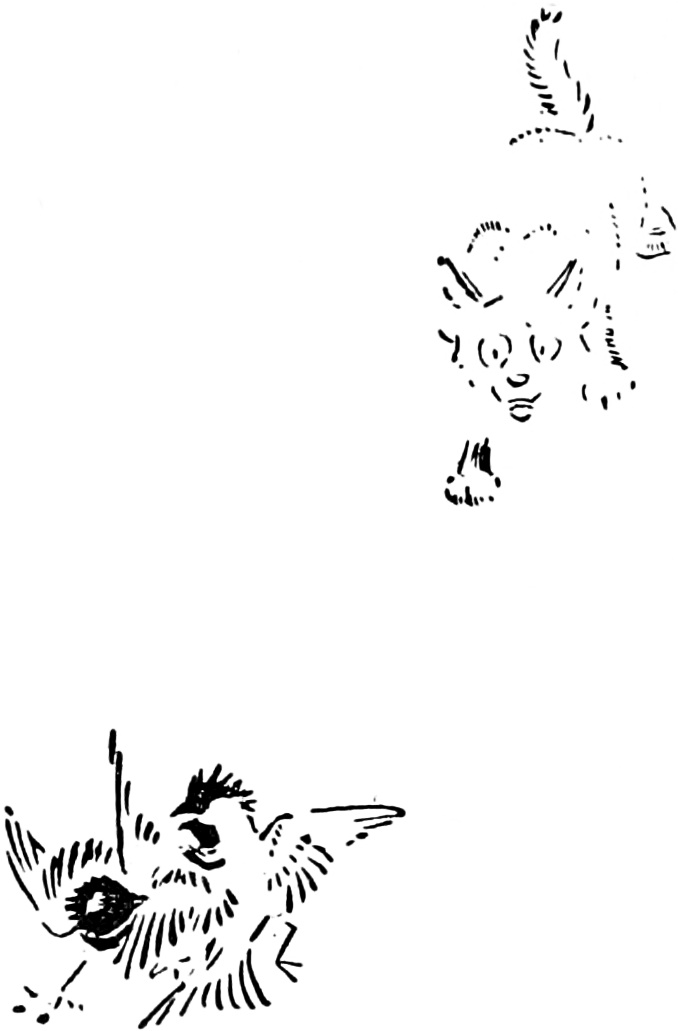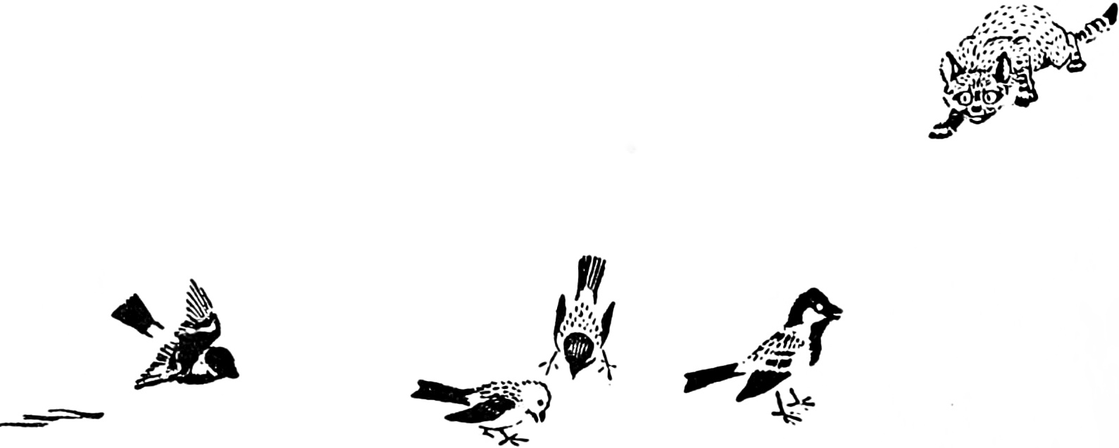 The night was spent chiefly in prowling about and learning the main lines of the iron-yard. The next day she passed as before, sleeping in the sun. Thus the time wore on. Sometimes she found a good meal at the garbage-box, sometimes there was nothing. Once she found the big Black Tom there, but discreetly withdrew before he saw her. The water-bucket was usually at its place, or, failing that, there were some muddy little pools on the stone below. But the garbage-box was very unreliable. Once it left her for three days without food. She searched along the high fence, and seeing a small hole, crawled through that and found herself in the open street. This was a new world, but before she had ventured far, there was a noisy, rumbling rush—a large Dog came bounding, and Kitty had barely time to run back into the hole in the fence. She was dreadfully hungry, and glad to find some old potato-peelings, which gave a little respite from the hunger-pang. In the morning she did not sleep, but prowled for food. Some Sparrows chirruped in the yard. They were often there, but now they were viewed with new eyes. The steady pressure of hunger had roused the wild hunter in the Kitten; those Sparrows were game—were food. She crouched instinctively and stalked from cover to cover, but the chirpers were alert and flew in time. Not once, but many times, she tried without result except to confirm the Sparrows in the list of things to be eaten if obtainable.
