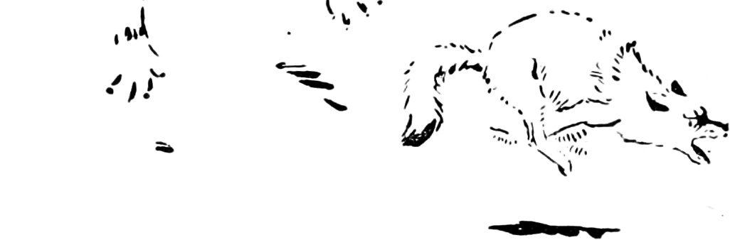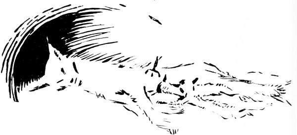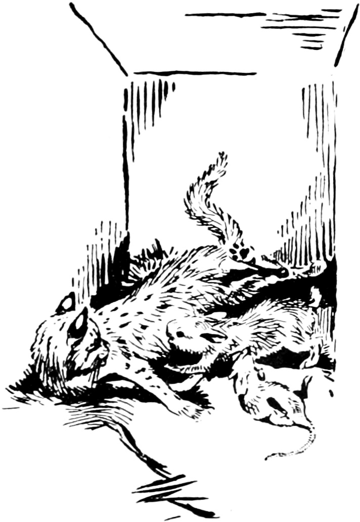 The Slum Kitten waited in vain for her mother. The morning came and went. She became very hungry. Toward evening a deep-laid instinct drove her forth to seek food. She slunk out of the old box, and feeling her way silently among the rubbish, she smelt everything that seemed eatable, but without finding food. At length she reached the wooden steps leading down into Jap Malee’s bird-store underground. The door was open a little. She wandered into a world of rank and curious smells and a number of living things in cages all about her. A negro was sitting idly on a box in a corner. He saw the little stranger enter and watched it curiously. It wandered past some Rabbits. They paid no heed. It came to a wide-barred cage in which was a Fox. The gentleman with the bushy tail was in a far corner. He crouched low; his eyes glowed. The Kitten wandered, sniffing, up to the bars, put its head in, sniffed again, then made toward the feed-pan, to be seized in a flash by the crouching Fox. It gave a frightened “mew,” but a single shake cut that short and would have ended Kitty’s nine lives at once, had not the negro come to the rescue. He had no weapon and could not get into the cage, but he spat with such copious vigor in the Fox’s face that he dropped the Kitten and returned to the corner, there to sit blinking his eyes in sullen fear.