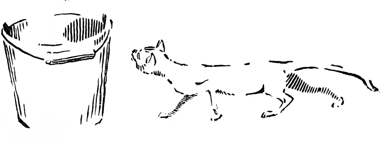 Thus the days went by for two months. She grew in size and strength and in an intimate knowledge of the immediate neighborhood. She made the acquaintance of Downey Street, where long rows of ash-cans were to be seen every morning. She formed her own ideas of their proprietors. The big house was to her, not a Roman Catholic mission, but a place whose garbage-tins abounded in choicest fish scrapings. She soon made the acquaintance of the meat-man, and joined in the shy fringe of Cats that formed the outer circle. She also met the Wharf Dog as well as two or three other horrors of the same class. She knew what to expect of them and how to avoid them; and she was happy in being the inventor of a new industry. Many thousand Cats have doubtless hung, in hope, about the tempting milk-cans that the early milk-man leaves on steps and window-ledges, and it was by the merest accident that Kitty found one with a broken lid, and so was taught to raise it and have a satisfying drink. Bottles, of course, were beyond her, but many a can has a misfit lid, and Kitty was very painstaking in her efforts to discover the loose-jointed ones. Finally she extended her range by exploration till she achieved the heart of the next block, and farther, till once more among the barrels and boxes of the yard behind the bird-man’s cellar.