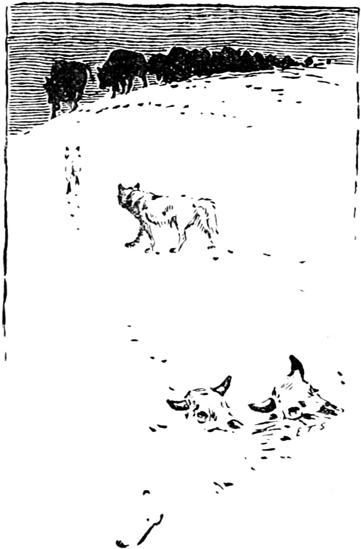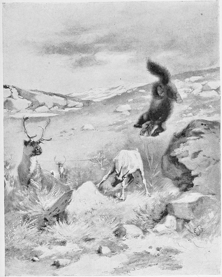More than once they had smelt that dreaded destroyer of the north that men call the Gjerv or Wolverene; and one day, as this danger-scent came suddenly and in great strength, a huge blot of dark brown sprang rumbling from a rocky ledge, and straight for the foremost—the White Calf. His eye caught the flash of a whirling, shaggy mass, with gleaming teeth and eyes, hot-breathed and ferocious. Blank horror set his hair on end; his nostrils flared in fear: but before he fled there rose within another feeling—one of anger at the breaker of his peace, a sense that swept all fear away, braced his legs, and set his horns at charge. The brown brute landed with a deep-chested growl, to be received on the young one’s spikes. They pierced him deeply, but the shock was overmuch; it bore the White One down, and he might yet have been killed but that his mother, alert and ever near, now charged the attacking monster, and heavier, better armed, she hurled and speared him to the ground. And the White Calf, with a very demon glare in his once mild eyes, charged too; and even after the Wolverene was a mere hairy mass, and his mother had retired to feed, he came, snorting out his rage, to drive his spikes into the hateful thing, till his snowy head was stained with his adversary’s blood.