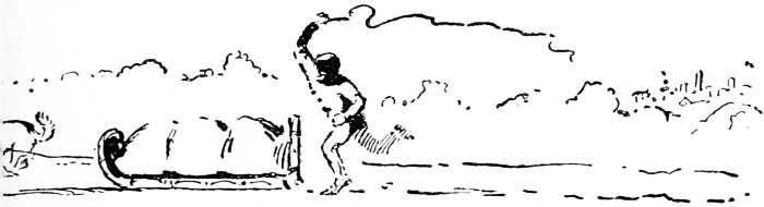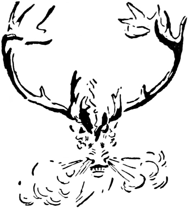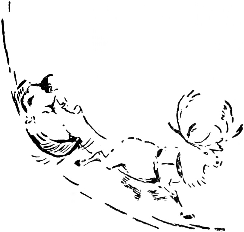 Once that day Rol essayed to drive the Storbuk. They set off at a good pace, the White Buk ready, responsive to the single rein, and his mild eyes veiled by his drooping lashes. But, without any reason other than the habit of brutality, Rol struck him. In a moment there was a change. The Racer’s speed was checked, all four legs braced forward till he stood; the drooping lids were raised, the eyes rolled—there was a green light in them now. Three puffs of steam were jetted from each nostril. Rol shouted, then, scenting danger, quickly upset the sled and hid beneath. The Storbuk turned to charge the sled, sniffing and tossing the snow with his foot; but little Knute, Sveggum’s son, ran forward and put his arms around the Storbuk’s neck; then the fierce look left the Reindeer’s eye, and he suffered the child to lead him quietly back to the starting-point. Beware, O driver! the Reindeer, too, “sees red.”