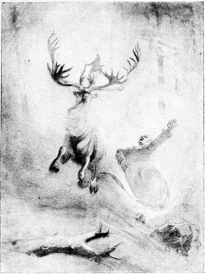 Down the winding highway they came, curving inward as they swung around the corner. At the voice on the bridge the Deer threw back his ears and slackened his pace. Borgrevinck, not knowing whence it came, struck savagely at the Ren. The red light gleamed in those ox-like eyes. He snorted in anger and shook the great horns, but he did not stop to avenge the blow. For him was a vaster vengeance still. He onward sped as before, but from that time Borgrevinck had lost all control. The one voice that the Ren would hear had been left behind. They whirled aside, off the road, before the bridge was reached. The pulk turned over, but righted itself, and Borgrevinck would have been thrown out and killed but for the straps. It was not to be so; it seemed rather as though the every curse of Norway had been gathered into the sled for a purpose. Bruised and battered, he reappeared. The Troll from the bridge leaped lightly to the Storbuk’s head, and held on to the horns as he danced and sang his ancient song, and a new song, too: