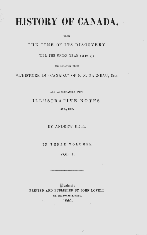 As the following reproduction, in English, of M. Garneau's "Histoire du Canada," is a moderately free, rather than a slavishly literal translation of that work, a few prefatory remarks are by him considered to be necessary for the information of his readers, more especially those who are not acquainted with the original.
