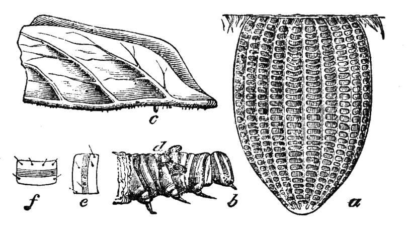 In about a week after the butterfly has deposited the egg, there hatches from it a very small caterpillar, not more than the tenth of an inch long. It however grows very rapidly, and soon becomes too large for its jacket. But its jacket is very accommodating, and when the little fellow has got tired of it and wants a new one, the old one splits down the back, so that he can crawl out of it with a new jacket on, and looking as bright and gay as any new suit. And now it is a very pretty little creature, with transverse bands of black, yellow, and white, and a pair of black horns near the head, and another pair not quite so long near the other end. If it is examined with a microscope a few black hairs will be seen on each segment; these are shown at e and f in fig. 11.