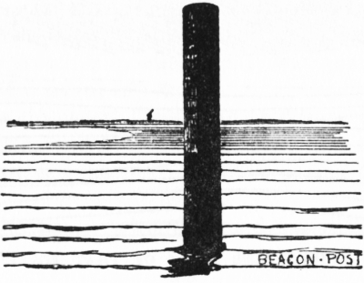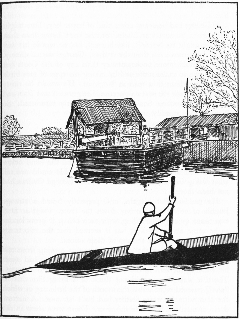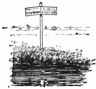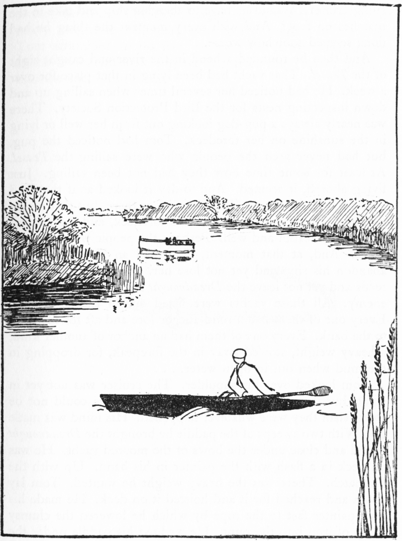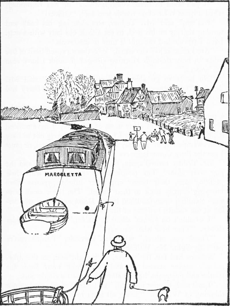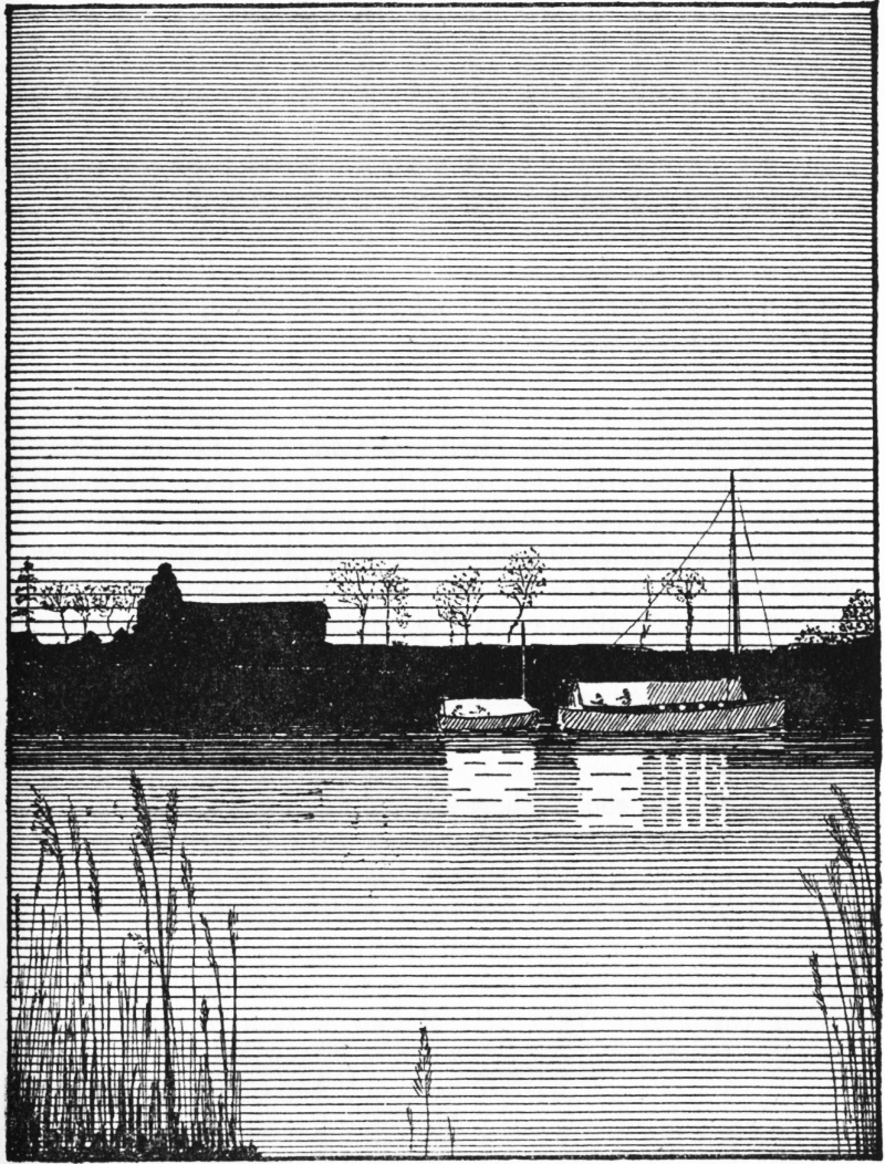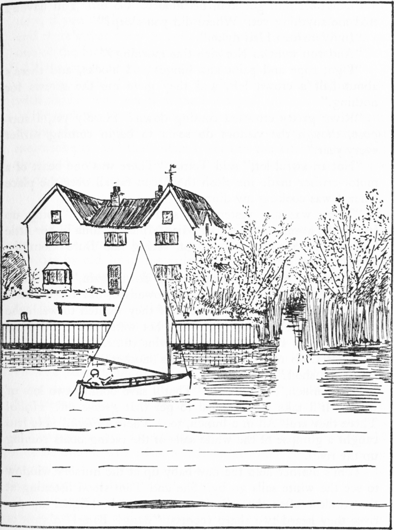 The Death and Glory was desperately tacking to and fro across the channel, losing ground with every tack, even though Bill and Pete were rowing to help her sail. On the southern side of the channel, beyond the red posts, the tide was rising round the after-cabin of the Margoletta. A black speck in the distance, the Margoletta’s dinghy was drifting towards the Reedham marshes.