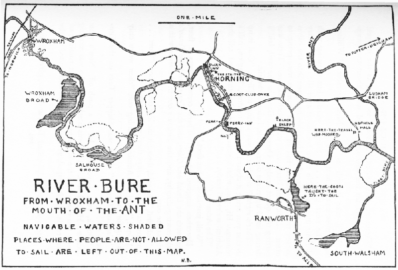 That is really the end of the story. But those who like to be quite sure about everything may want to know a little more. The fleet set sail from Acle to Horning after a very early breakfast, and the twins had Flash all ready for the race before their A.P. came home. Tom moored the Teasel at Horning Staithe, where Jim Wooddall in Sir Garnet was moored too. The Admiral, Tom, Dick, Dorothea, and William aboard the Teasel, and Jim and his mate aboard the wherry, had a splendid view of the end of the race, which Flash won by the length of a short bowsprit. Dick and Dorothea went off home with proper discharge certificates, signed by three skippers and an admiral, to say that they could fairly be counted able-bodied seamen. The Admiral’s Brother Richard came back from London and sailed off again in the Teasel with the Admiral, and she rather enjoyed telling him, whenever things went a little wrong, that he ought to take some lessons from the Coots. The Admiral and he went to see the Dudgeons, and he pleased the doctor and his wife and Tom too, by painting a portrait of “our baby,” which was admired by a great many people when it was exhibited at Burlington House. Nothing more was seen of the Hullabaloos. They had had enough of the Margoletta, went straight home to town and had their wet luggage sent after them. Old Bob kept his word and explained to Rodley’s how much they owed to the salvage men of the Death and Glory. And Rodley’s were so pleased that they took the Death and Glory out of the water and scraped her and gave her a new coat of paint, and a new sail and spars, and an awning as good as the Titmouse’s, and something over in the way of pocket-money for all three members of her crew.