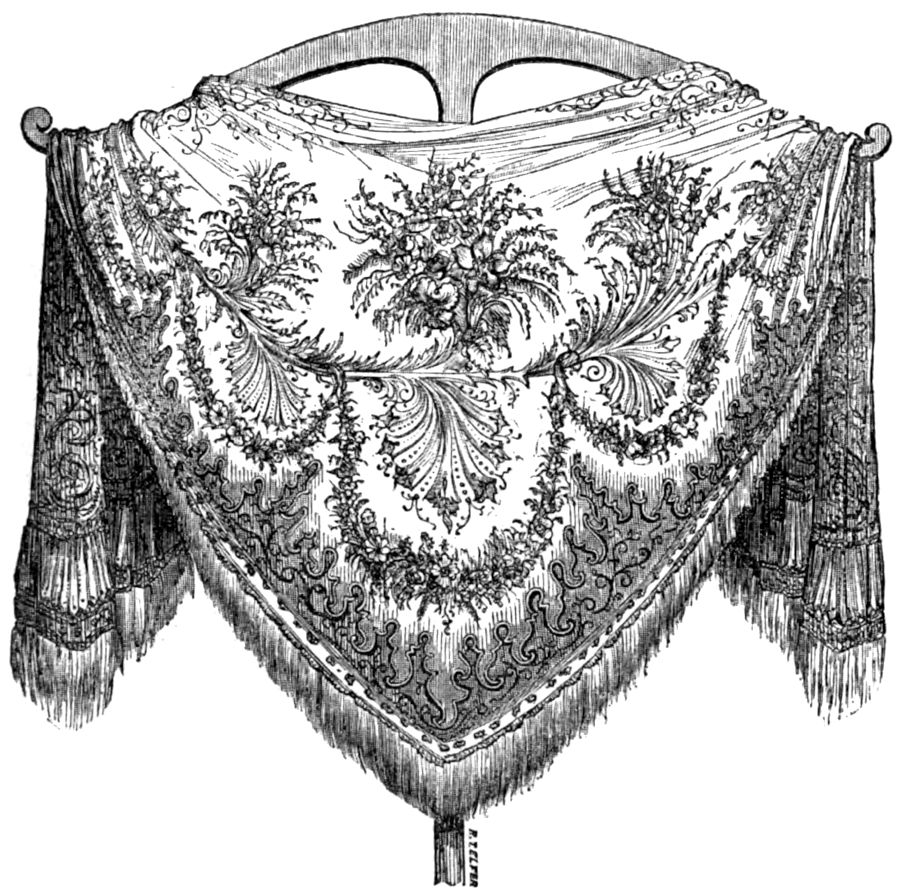 Every woman who visits the French exposition of domestic manufactures, whether she be young or old, brunette or blonde, stops involuntarily before the beautiful shawls exhibited, the exquisite designs of which draw from her a half suppressed sigh of loving desire; but in passing away from them she only laments that her limited means do not equal her longings for possession, without giving a thought to the artist who has labored by day and meditated by night to produce an article of dress worthy of her charms. The designer of a beautiful fabric, however, merits not only a thought, but deep sympathy, particular interest. Banished between Apollo and Mercury to a domain where the laurel does not flourish, he at once cultivates the fine arts and commerce, the ideal and the real. Up to a certain point he possesses the inspiration of the improvisatore, the conception of the painter, and the sentiment of the colorist. But if this industrial centaur does not join to these qualities a little of the management of the merchant, then comes a sad result, for probably he will at last be brought to the door of a hospital, broken down with useless labor, without one ray of glory having touched his brow or warmed his heart. I could cite a remarkable but sad instance of one possessing fine talents, united to an excellent and lovely character, to illustrate this mournful fancy, but I should only cause melancholy thoughts, from which I should preserve my reader. I will, on the contrary, recall a more fresh and joyous reminiscence apropos to this pleasant season.