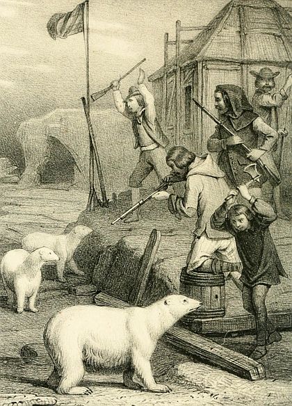Les ours avaient disparu avec le jour; ils reparurent avec lui. Un de ces animaux s’avança un jour par les degrés qu’on avait dû creuser dans la neige pour descendre jusqu’à la hutte, et se dirigea vers la porte, qui se trouvait alors ouverte. Les Hollandais n’eurent que le temps de la fermer et de se grouper derrière pour résister aux efforts que faisait l’ours pour la renverser. Tout à coup l’animal furieux grimpe sur le toit, et s’attache à la cheminée qu’il agite avec violence; les matelots étaient tremblants; il leur semblait à chaque instant que leur ennemi allait se rendre maître de ce passage: heureusement il n’en fut rien, mais l’ours ne se retira qu’après avoir ravagé une partie de la toiture. Pendant qu’il s’éloignait, on l’atteignit d’un coup de feu dans les reins, puis on courut à lui pour l’achever. Sa graisse fut fondue et servit de nouveau à l’entretien des lampes.