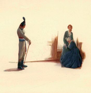 Outside by the horses, visible in the light that streamed through the open door, stood Fougereot’s wife and their two big lads and Filomène. Came brief but touching farewells between the seigneur and his shrunken family. The Fougereots, all four, were in tears, not only at parting with their vicomte, but at what else remained to be done. This and the stifled sobbing of Filomène moved him so profoundly that he could not trust himself to speak. In silence he wrung the hand of each in turn, then got to horse. It was Mademoiselle de Montsorbier who spoke for him now.