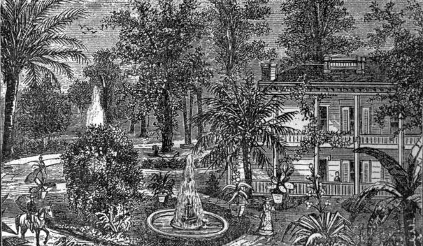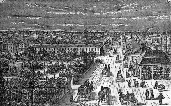 It seems but fitting in connection with the meeting of the Mississippi Valley Fruit Growers’ Association, to give our readers some idea of the appearance of this city, and of its horticultural productions as they appear in the last days of the month of February. The thermometer during our stay ran up as high as 78° in the shade, and continued so warm during the night as to make the room uncomfortable unless the windows were fully open and the fresh air allowed free entrance. Yet we found that sudden changes of temperature were by no means exceptional here, for within twenty-four hours the thermometer fell fully forty degrees, and we were awakened in the night by such a change in the temperature as required the closing of the windows and looking up of heavy blankets in order to secure our physical comfort. Yesterday light clothes were almost a burden, to-day our woollen wraps and overcoats scarce make us comfortable when exposed to the chilling wind which prevails. Notwithstanding this, vegetation seems to come forward, and the fig trees are putting forth their leaves. The broad-leaved evergreen trees, which are very abundant here, give a summer-like appearance to the public squares and gardens which would look nearly as bare as our own without them. The Japanese plum trees, as they are called (the Mespilus), are now laden with fruit, some of which is already ripe, and the trees of the bitter orange, which are planted for ornament in the public squares and on many of the streets, are loaded with golden fruit which contrasts beautifully with the dark green of the foliage. The accompanying engraving is a picture of the Carrollton gardens in New Orleans, in which will be seen specimens of palm, banana and yucca, from which our readers will at once perceive that the climate in its greatest severity must be mild indeed, compared with the frost which we experience. The avenue by which we approached these gardens seems to be the favorite place of residence for the substantial business men of the city, which had more or less of lawn and garden attached; and it was to us a new sight indeed, to see Oleanders fully fifteen feet high, and Camellia Japonicas laden with flowers, Crape Myrtle, Pittisporum, Spanish Bayonet, and such like plants as can be grown here only in conservatories, flowering in the open ground. Roses too, of the tender, ever-blooming kinds, which we shelter with so much care during the winter months, were here climbing over fences, trellis and walls in great profusion and laden with flowers. Marshal Neil seemed to be at home here, displaying its magnificent half open buds in size and abundance quite astonishing to us who have to train it under glass. There was one peculiarity that struck us as quite novel in the structure of their cisterns for holding rain water. These were all above ground, from which we infer it is impossible for the people to have cellars beneath their houses. Indeed, at this time the city was below the level of the water in the river, so that if the banks of the Mississippi were to give way, at least the first story of the dwellings would be wholly submerged. We found too, on visiting the cemeteries, that instead of burying their dead beneath the surface of the ground, they built brick and stone vaults in long avenues, wherein the bodies of their dead were deposited. One of the public squares of the city, near the famous French market, is known as Jackson square, and we were surprised to find the gardener trimming hedges of the evergreen Euonymus, which did not shew the least injury from the winter. Camellias were laden with bloom, the fragrant Olive mingled its odors with the opening flowers of the orange; the bananas were putting forth their new leaves, and the yucca alœfolia was in full bloom. Verbenas looked as though they had remained in the borders all winter, and the Alternanthera had only been partly killed back by the cold weather. The accompanying cut of Jackson square, which gives also a birdseye view of the French market and part of the river, will illustrate the appearance of the city at this season of the year. In visiting the market we found little fruit besides oranges, lemons, bananas and Japanese plums; and very surprising it was to us to find that the oranges were either from Cuba or the Mediterranean. The vegetables were cabbage, lettuce, onions and garlic. The peas and beans could hardly be said to have arrived, a peck here and there being all we could find, with a few half grown carrots and beets. The meat market would bear but poor comparison with any meat stall in the smallest town in Canada. The beef seems to be coarse grained, thin and lean, with a dark bluish cast, anything but inviting to the palate of one accustomed to the use of Canadian beef. The fish market was more bountifully supplied with a considerable variety of fish, many of them new to us. On inquiring their names we found that they give the name of trout and pike and bass to fish very unlike those which are called by these names with us, while others, such as redsnappers, redfish and the like, were wholly new, both in name and appearance. Judging from our experience of the fish when brought upon the table, we would say that in richness of flavor, fineness of grain and firmness of flesh, they are not by any means equal to the fish of our Canadian waters; and even the oysters, of which so much has been said, lack the flavor of the oysters of Long Island Sound. This city seems to be growing in commercial importance. Ocean steamers lie at its wharves, taking in cargoes of cotton, rice and sugar, and discharging cargoes brought from foreign ports, and a general activity seems to pervade the whole city, which denotes business thrift. We had not time to visit the manufactories of ice and sugar, for which the place is famous. On the whole the city presents many attractions to the Northerner for a sojourn during a part of our cold winter months; but for variety of horticultur