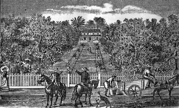 At the time of the visit of the society the orange trees were just coming into bloom, filling the air with delightful fragrance. The fruit had all been gathered, save that which remained upon a few trees of the bitter orange, not fit for food, and only grown as an ornamental tree. The fruit of the orange is ripe in November and December, when it is gathered and packed as fast as the demand may require, usually completing the harvest in about a month. The first six months of the year are devoted to market gardening. The cabbage, tomato and cucumber plants are started under glass, and as the weather will permit, and the growth of the plants may require, they are transplanted into the open ground. The business of gathering, packing and marketing is carried on systematically with about twenty-five colored hands. By the 1st of July the ground crops are gathered and shipped, and the whole place sowed with cow peas to be turned under ground as a fertilizer. Mr. Roundtree said that from the first of July till first September, “we all take a holiday, going up and down the country hunting up recreation according to our several tastes.” By the first of September the business of turning under the cow peas begins and the ground is got in readiness for the winter crops. The accompanying engraving which we have copied from a picture we found, renders some idea of the appearance of Mr. Roundtree’s place in the month of December, when the work of orange gathering is going on. The novelty of such operations being conducted at such a time is not without its charm to us who at that season are battling with frost and snow, amid leafless trees, whose fruits have long since been gathered.