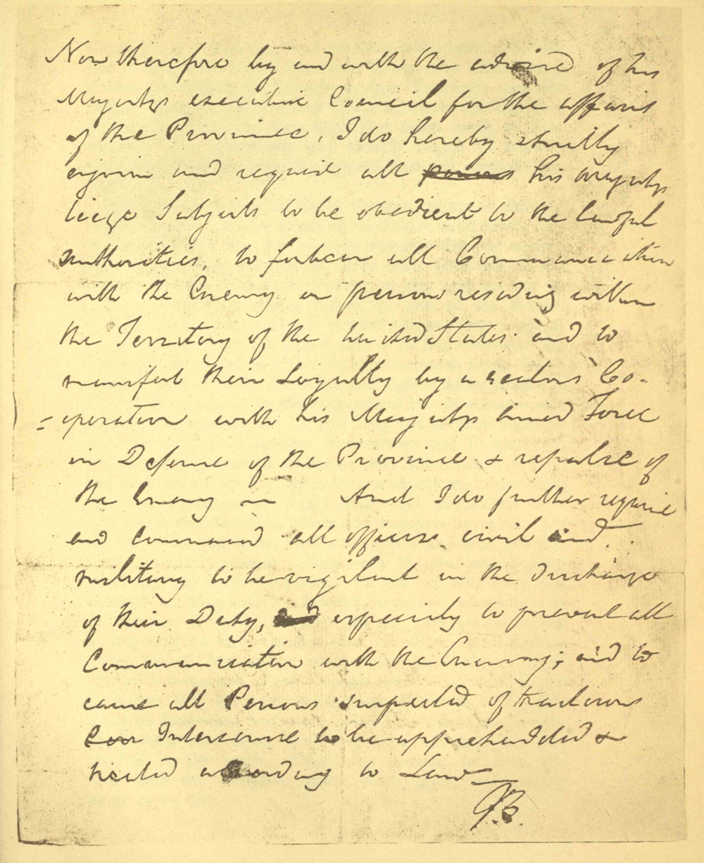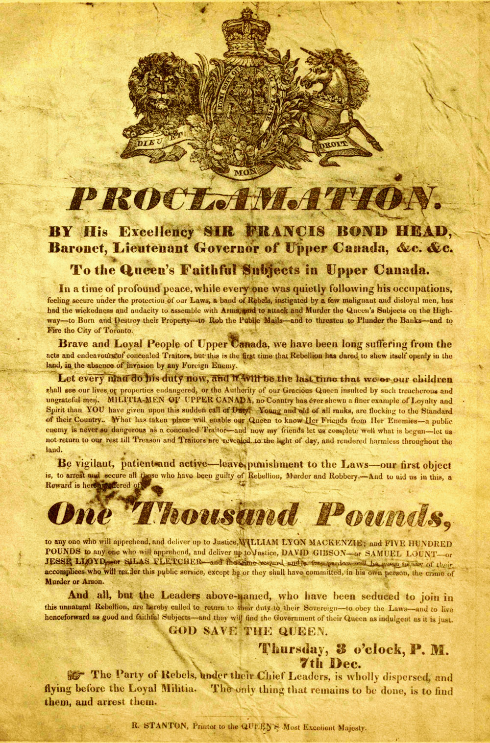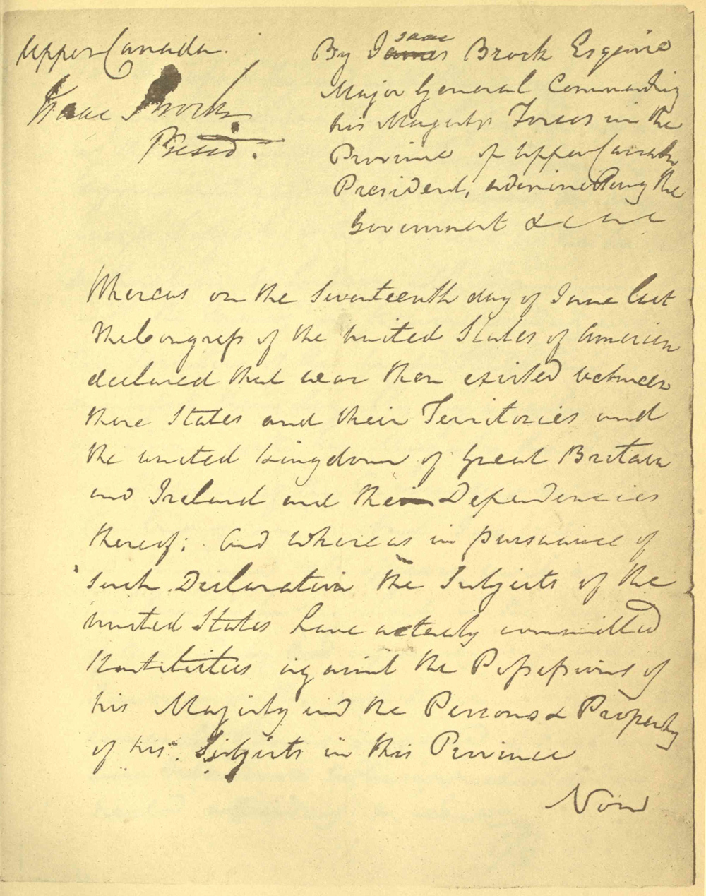 Brave and Loyal People of Upper Canada, we have been long suffering from the acts and endeavours of concealed Traitors, but this is the first time that Rebellion has dared to shew itself openly in the land, in the absence of invasion by any Foreign Enemy.