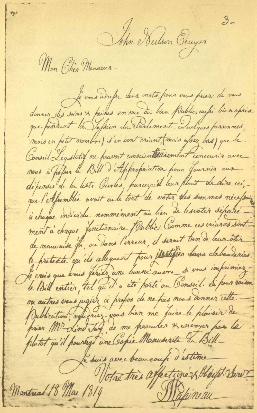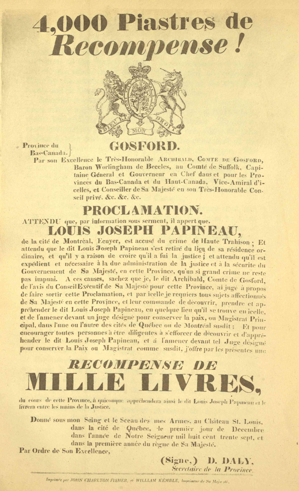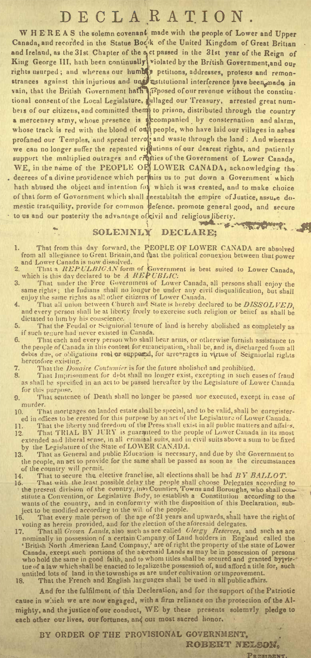 WHEREAS the solemn covenant made with the people, of Lower and Upper Canada, and recorded in the Statue Book of the United Kingdom of Great Britian and Ireland, as the 31st Chapter of the act passed in the 31st year of the Reign of King George III, hath been continually violated by the British Government, and our rights usurped; and whereas our humble petitions, addresses, protests and remonstrances against this injurious and unconstitutional interference have been made in vain, that the British Government hath disposed of our revenue without the constitutional consent of the Local Legislature, pillaged our Treasury, arrested great numbers of our citizens, and committed them to prison, distributed through the country a mercenary army, whose presence is accompanied by consternation and alarm, whose track is red with the blood of our people, who have laid our villages in ashes profaned our Temples, and spread terror and waste through the land: And whereas we can no longer suffer the repeated violations of our dearest rights, and patiently support the multiplied outrages and cruelties of the Government of Lower Canada, WE, in the name of the PEOPLE OF LOWER CANADA, acknowledging the decrees of a divine providence which permits us to put down a Government which hath abused the object and intention for which it was created, and to make choice of that form of Government which shall reestablish the empire of Justice, assure domestic tranquility, provide for common defence, promote general good, and secure to us and our posterity the advantage of civil and religious liberty.