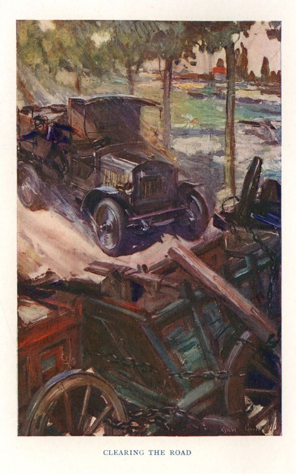 Shells now began to explode, as it seemed, all around them. The sky was darkened by the smoke, poisonous fumes almost choked them. Only the great speed of the car and the slight changes in its direction due to the windings of the road preserved them from annihilation. The thought that flashed through Pariset's mind was that if the Germans had used shrapnel instead of shell they must almost certainly have been destroyed, for he could not doubt that the whole battery was now playing upon them.