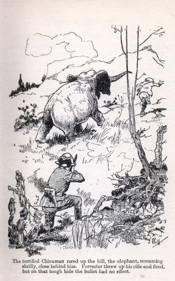 THE TERRIFIED CHINAMAN RACED UP THE HILL, THE ELEPHANT, SCREAMING SHRILLY, CLOSE BEHIND HIM. FORRESTER THREW UP HIS RIFLE AND FIRED, BUT ON THAT TOUGH HIDE THE BULLET HAD NO EFFECT