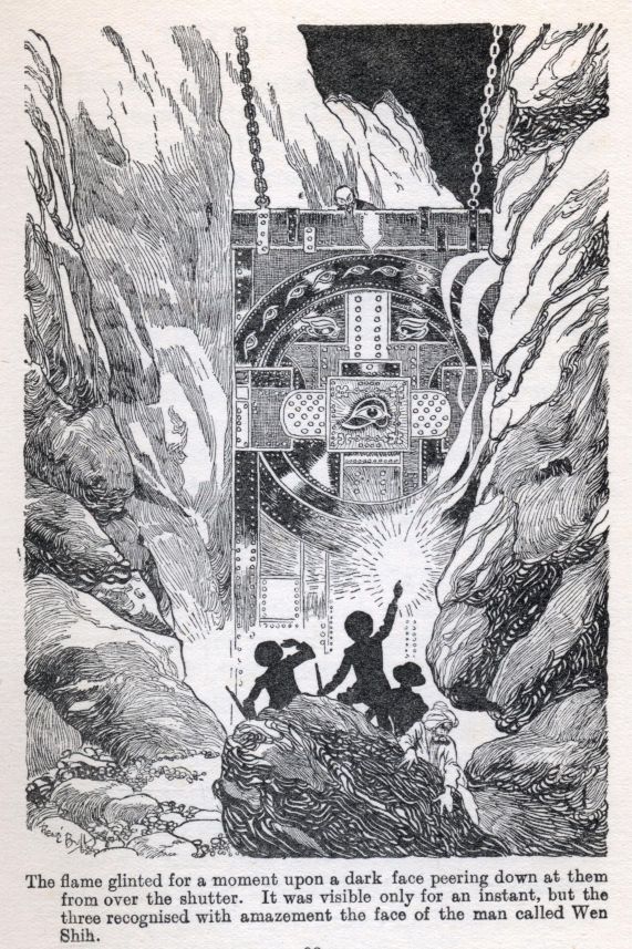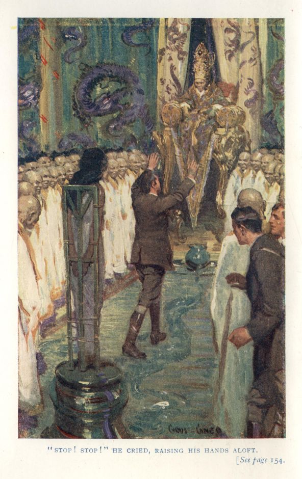 The priests were swarming across the garden, jostling one another in the narrow gate, leaping towards the pagoda. Infuriated at the loss of their colleague, just promoted to the higher rank, and at the trick played upon them, they knew that the "foreign devils" no longer had the Eye at their command, and already gloated over their slaughtered bodies. Venting shrill cries of frenzy, they made straight for the entrance, reckless and without order.