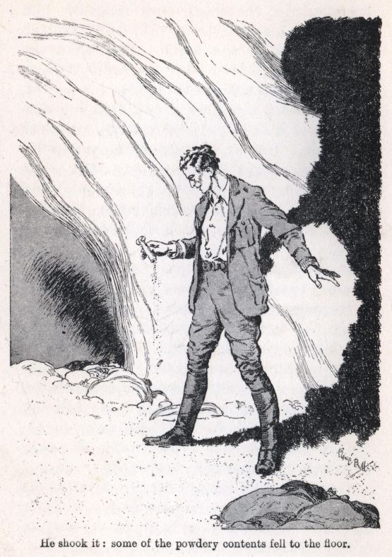 HE SHOOK IT: SOME OF THE POWDERY CONTENTS FELL TO THE FLOOR